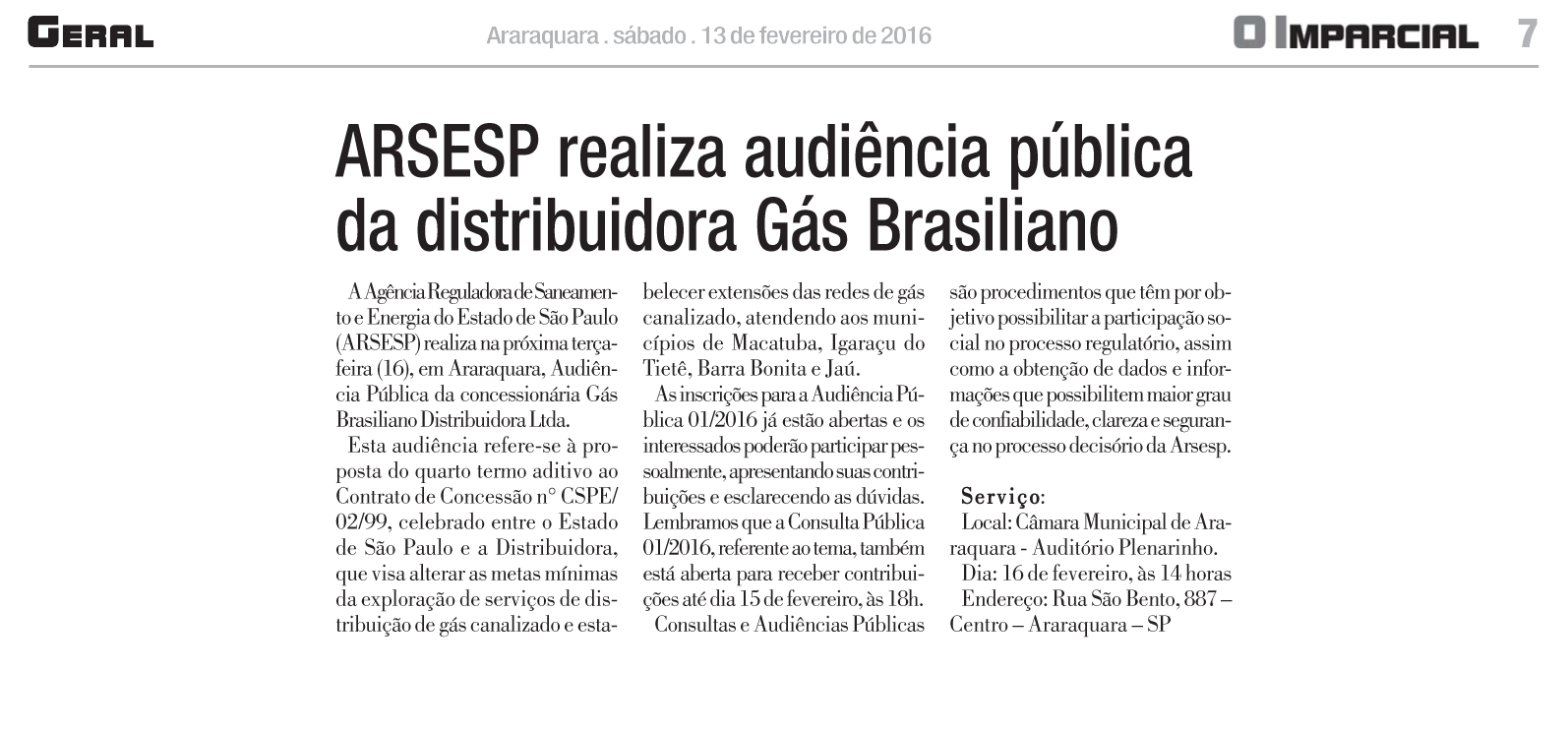 A Agência Reguladora de Saneamento e Energia do Estado de São Paulo (ARSESP) realiza na próxima terça-feira (16), em Araraquara, Audiência Pública da concessionária Gás Brasiliano Distribuidora Ltda.